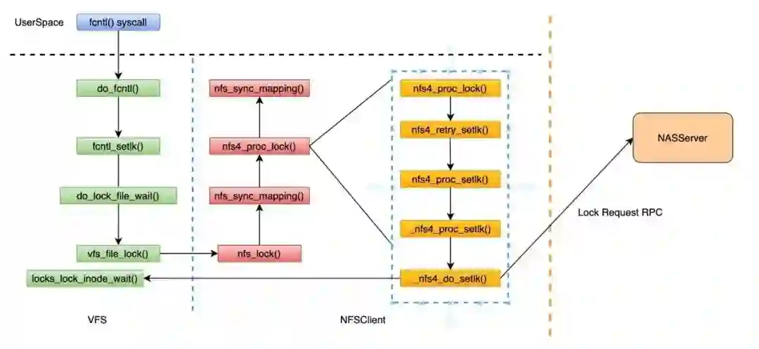 系统调用管理NFS文件锁,下面是NAS使用NFSv4挂载时获取文件锁的调用过程: