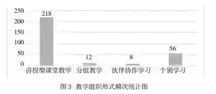 电子书包环境下语文阅读课堂理论上已经具备了学生开展自主学习、合作学习的条件和支持。但从数据分析,发现目前语文阅读课中,教师的讲授式教学还是占主导地位,其次是学生的个别学习,分组教学和伙伴协作学习相对都比较低。教学组织形式频次统计如右图3所示。在信息技术的支持下,教师教学正在探索转向以学生为中心的教学方式,但目前还没留给学生充分的自主权,教师教学组织方式仍受到教师水平、班级人数等原因的限制。但从视频分析中也可以得出,虽然课堂中较少采用了分组教学和伙伴写作学习的形式,但是在讲授型课堂教学中已经有了很多数字化技术的元素。