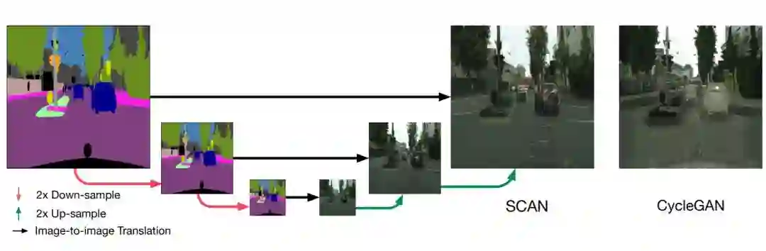 在 SCAN 中,一个复杂的图像到图像转换问题被分解为多个更简单的转换阶段。最开始低分辨率的阶段学习了大致的图像低频信息转换过程,后续高分辨率的阶段学习了如何逐步添加图像高频细节。