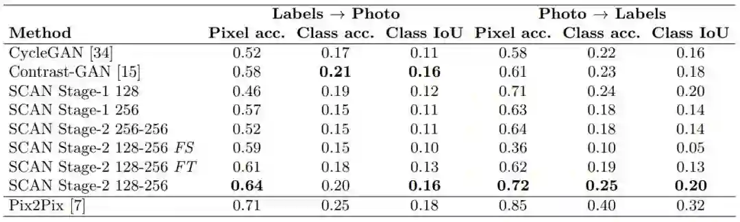 图 3 展示了在 512x512 分辨率下,标签图转换成照片的直观结果。可以看到,与 CycleGAN 相比,本文提出的 SCAN 能够生成更具真实感的照片。