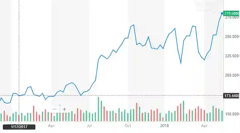 百度截止 2018 年 5 月 17 日股价变化,来源:Yahoo Finance