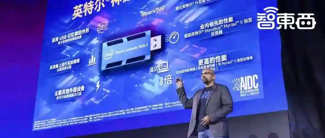 会上,Naveen Rao还推出了英特尔第二代Movidius神经网络计算棒,基于Myriad X VPU打造,与上一代相比有着8倍的性能提升,其AI计算速度有着大幅度提升。用户只需要将U盘大小的计算棒插入USB接口里,就能够用上强大的AI计算力。