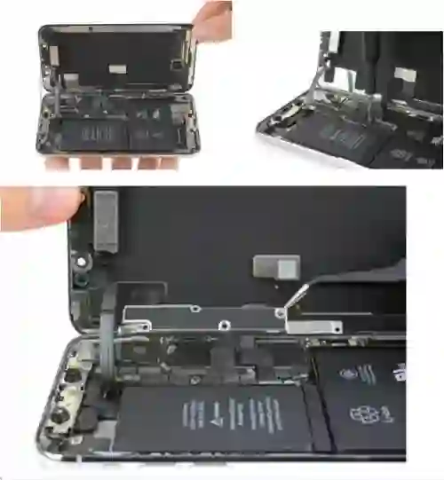 苹果为了在尺寸有限的主板上投入更多的技术,将主板折成了两半,两个部分是焊接在一起的,需要将它们分离开来。将两层主板分离之后发现,对比 iPhone 8 Plus 的主板来说,总面积增大了 35%,但双层堆叠的设计缩小了空间占用面积。然而这个聪明的设计的缺点是板级修复将非常困难(在某些情况下几乎不可能修复)。