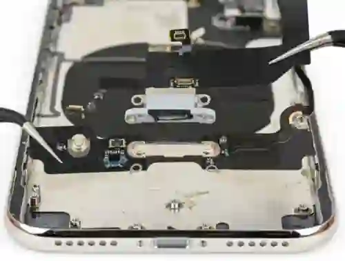 接下来我们来看Lightning接口。iPhone X的Lightning接口更加耐用,它有一个更宽的支架,通过螺丝固定在框架的侧壁上。