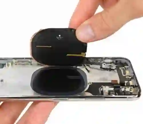 在iPhone X的金属外壳上,我们看到了另一个熟悉的部分:无线充电线圈。当然,还有音量按键、铃声/静音开关和一个未知的传感器支架。