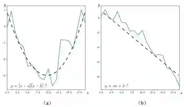 当得到如图5所示的两组数据时,我们应该如何用模型去描述数据的变化规律呢?对于图5a,数据的图形有点像抛物线,因此选择二次多项式拟合是一个比较合理的选择。于是假设模型的形式为y=(x-a)(x-b)。然后使用数据去估计模型中的未知参数a,b。得到的结果还不错,模型的预测值与真实值的差异并不大。