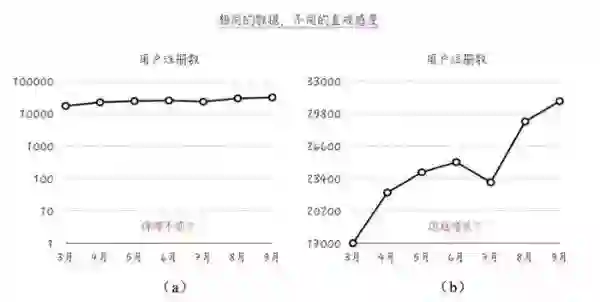 如图4所示,我们将某APP每月的用户注册数表示在图中。图4a给人的直观印象是每月的安装数是大致差不多的,没有明显的增长。而图4b给人不同的印象,从3月份开始,用户注册数大幅度增长。但其实两幅图的数据是一模一样的,给人不同的感觉是因为图4a中纵轴的起点是0,而且使用了对数尺度;而图4b的纵轴是从17000开始的,而且使用的是线性尺度。