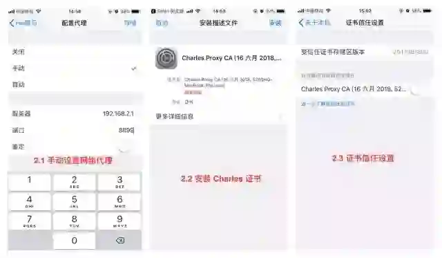 2.2、安装 Charles 证书。打开 Safari 浏览器,输入如上图 "两步操作" 的第 2 步地址。按提示安装 Charles 证书。