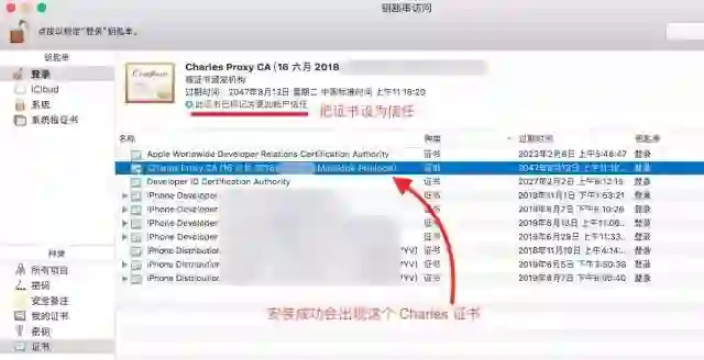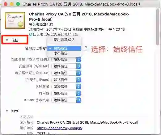 2、Charles 证书的信任。先打开钥匙串,看看是否安装成功了没。成功了,双击该证书,点击 "信任",展开后出现如下,选择:始终信任。