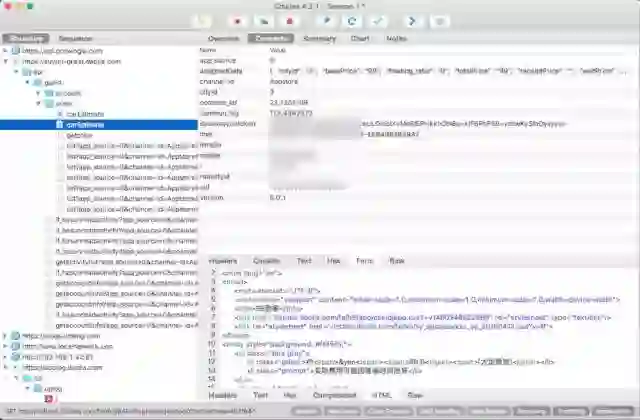 先正常的打开 Charles 这个页面把玩几下,Charles 就会抓取很多接口和域名分类了。在这里找到你这个页面所属的域名分类应该不难。再次进入调试界面,会通过刚才打断点的那个域名来请求数据,请求就会被断点拦住,如下图所示。
