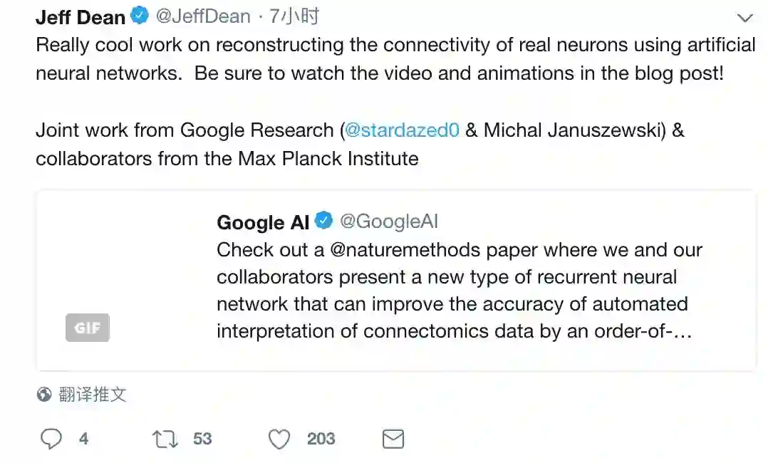 Jeff Dean 随后也在 Twitter 上转发评价称,“使用人工神经网络重建真实神经元的连接性研究真的很酷。”