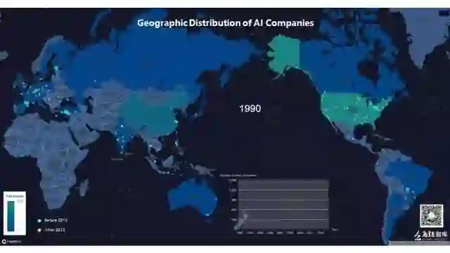观察1990年的全球AI企业地理分布,我们可以看到,欧洲与美国的AI企业数量较多,此时的中国尚未加入到人工智能竞争的行列中,但也有了早期萌芽。
