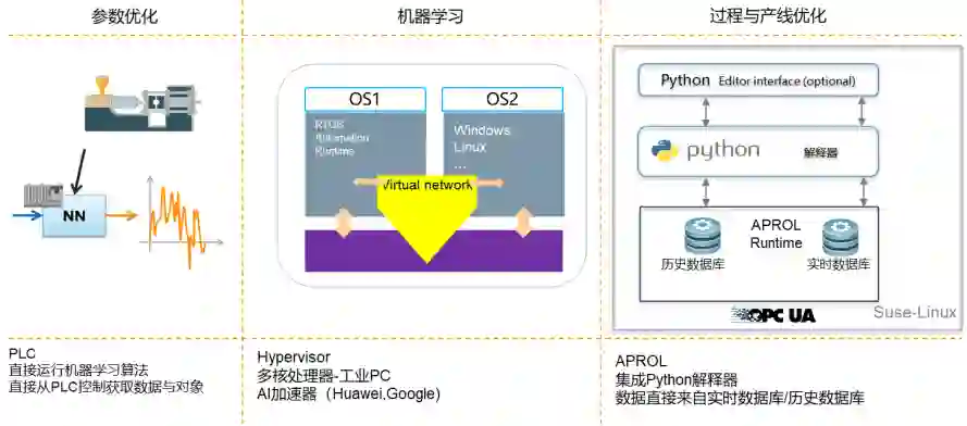其实,普通的控制器就可以做一些简单的学习—想想,AI就是一个程序啊!贝加莱这个控制器本来就可以高级语言编程(追溯到1993年),当然了,控制器本身主要业务是干控制,真正想干AI大的任务还是得用贝加莱集成Hypervisor技术的APC,这个可以支持Windows或Linux可以去处理AI程序开发和与控制任务(RTOS核)交互,PCIe的卡槽里可以插入一个华为ATLAS加速器这样的大算力,然后通过OPC UA到云端训练,下载到AI加速器上本地推理,并与运动控制、机器人进行交互,就可以干智能导引、缺陷检测与处理、预测性维护、参数寻优等活啦!