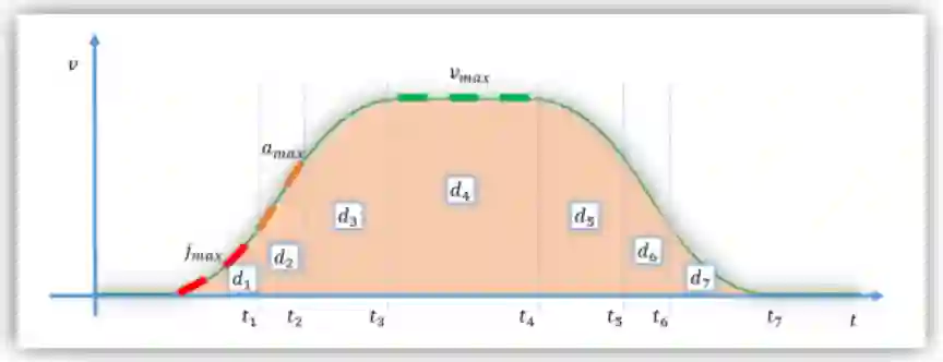 例1:前沿送纸机构精准的送纸是模切质量与效率保障的关键,其传动采用伺服的电子凸轮曲线来完成,在运动过程中,纸张的规格、类型、速度、加速度、机械磨损等都会影响送纸的精度,如何让机器更为“智能”,即,如何自主根据变化来适应获得最佳的凸轮曲线参数,电子凸轮曲线由多个多项式构成,如图8所示,而每段有速度、加速度、加加速度作为参数,如何为其制定最佳工艺?