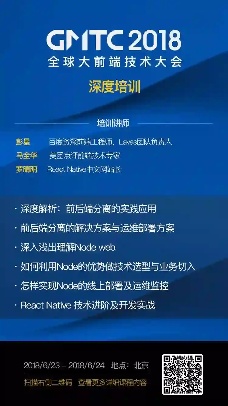 6月 23-24日,GMTC还特设了为期 2天的技术深度培训,邀请了百度、美团点评的前端技术专家以及 ReactNative中文网站长,围绕前后端分离、Node.js、React Native等热门前端技术的最佳实践案例,展开从入门到应用的落地分享。
