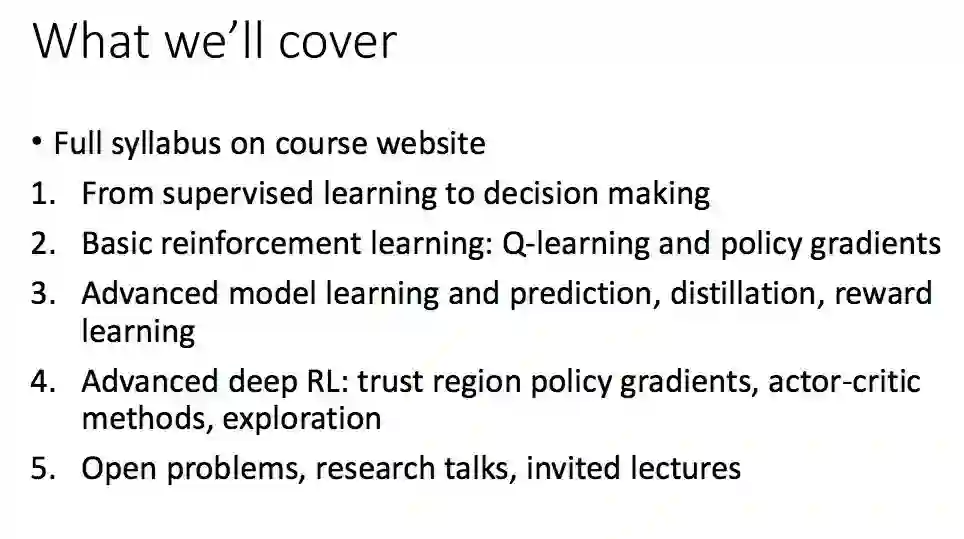 以下是 CS 294 深度强化学习 2017 年秋季课程的主要内容概要,所有的授课文档与视频都已经发布且展示在课程主页中。