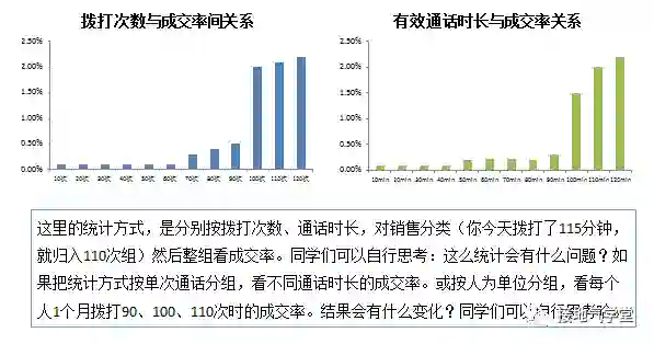 就如同开篇的问题一样,看似拨打100次以上,有效通话100分钟以上的人业绩好,可反问一下:
