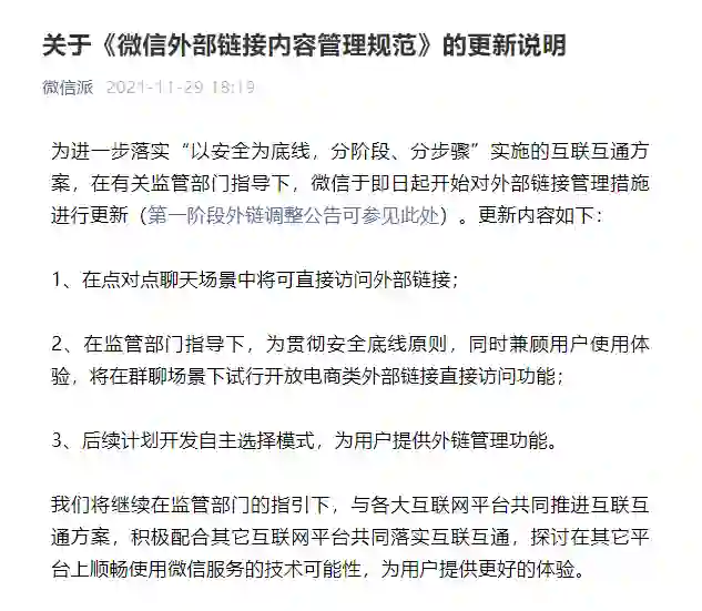 《微信外部链接内容管理规范》昨晚正式发布,表示为了能与各大互联网平台共同推进互联互通方案,将在监管部门指导下,在点对点聊天场景中将可直接访问外部链接,还将在群聊场景下试行开放电商类外部链接直接访问功能。除此之外,后续计划开发自主选择模式,为用户提供外链管理功能。