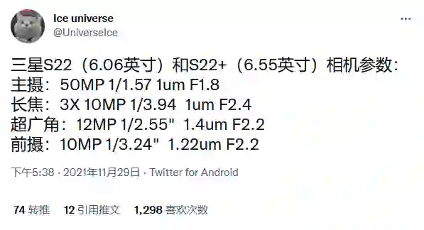 数码博主 @i冰宇宙 今日在推特分享了 Galaxy S22 和 Galaxy S22+ 的相机规格参数。在推文中表示,Galaxy S22 会配备 6.06 英寸的屏幕,而 Galaxy S22+ 会配备 6.55 英寸的屏幕,两者的相机规格参数完全相同。