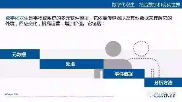 在三到五年内,数以亿计的物件将由数字化双生的形式呈现。组织将使用数字化双生主动修复和规划设备服务、规划制造流程、操作工厂、预测设备故障或提高运营效率,以及执行增强的产品开发。因此,数字化双生最终将成为技术人员和传统监测设备和控制(例如,压力计,压力阀)的组合的代理。