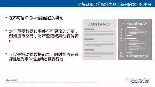 该趋势预测的要点就是在不可信环境中增加信任的机制,对于重要数据和事件不可更改的记录,例如货币交易、财产登记或其他有价资产,不仅是被动式数据记录,同时能够有选择性的为事件增加动态预置行为。