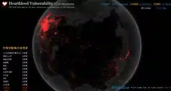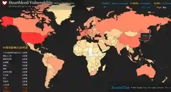 比如在 2014 年,一些用户在使用开源的 OpenSSL 库时发现其存在 Heartbleed 安全漏洞(也称心脏出血漏洞)但是在当时开源 OpenSSL 库已经被广泛使用,整个互联网行业中有接近 2/3 的 Web 服务器在使用存在 Heartbleed 漏洞的 OpenSSL 进行密码、信用卡等敏感信息的传输。我们可以看下 ZoomEye 当时专门针对 OpenSSL 漏洞制作的漏洞影响统计: