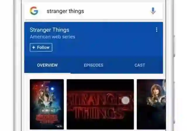 而Google不仅会根据用户的搜索记录提供相应的资讯,在用户进行搜索时,Google还会在搜索结果中会提示相应可供关注的主题,例如电视剧《Stranger Things》,Google会把这部电视剧的新进展、新消息推送给你。可以说GoogleFeed真正做到了将推荐和搜索有机的结合在了一起。