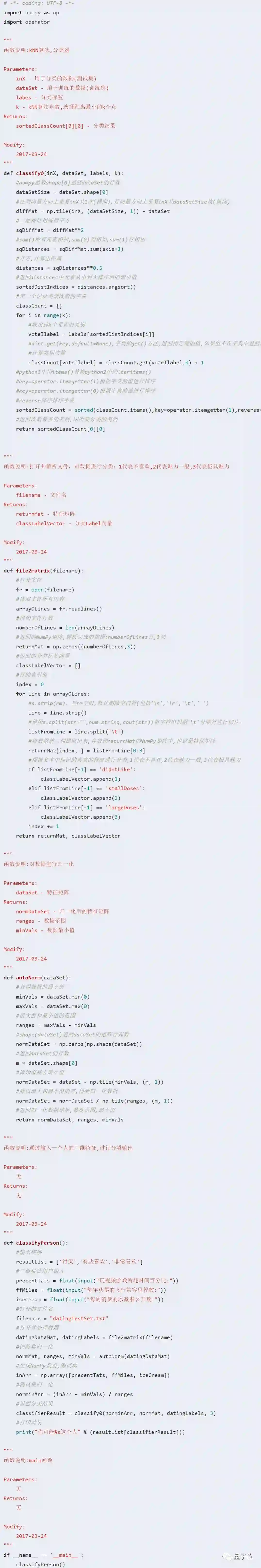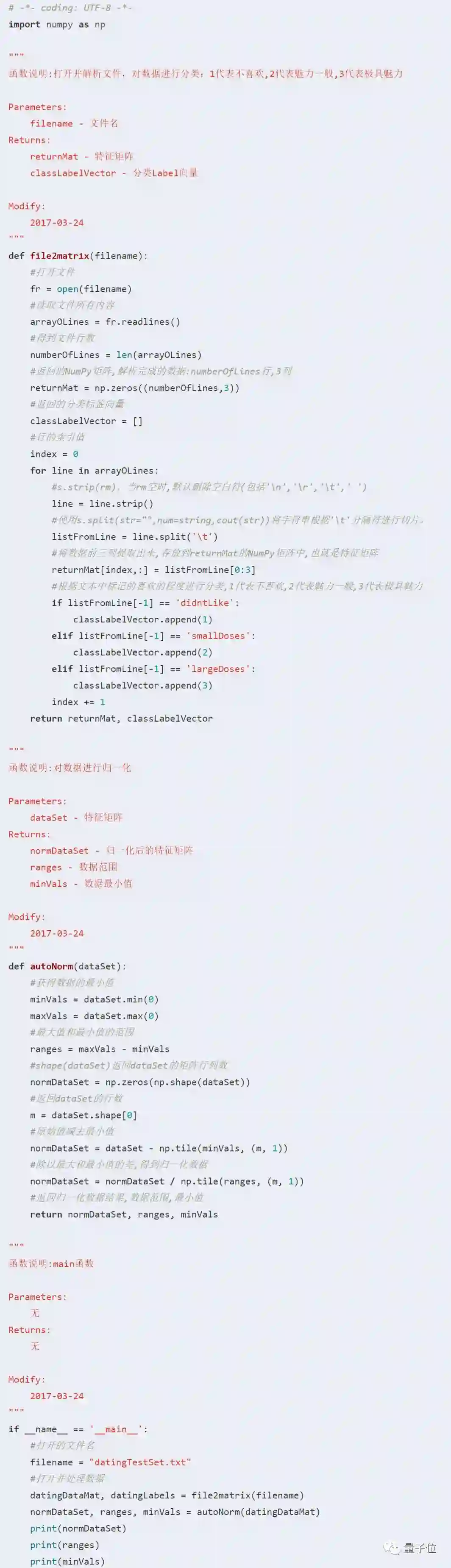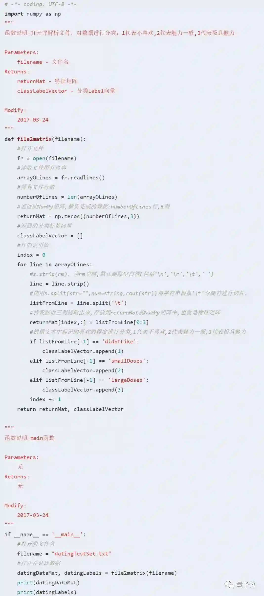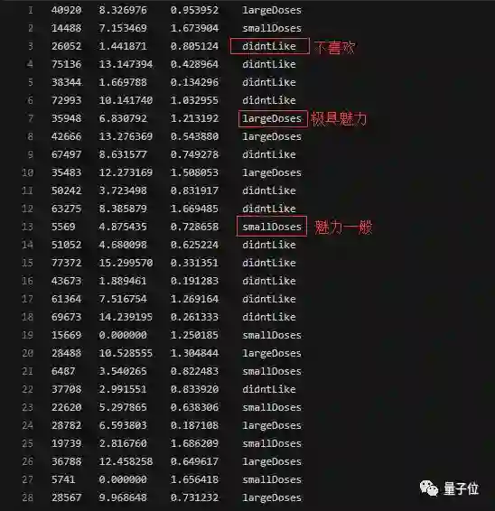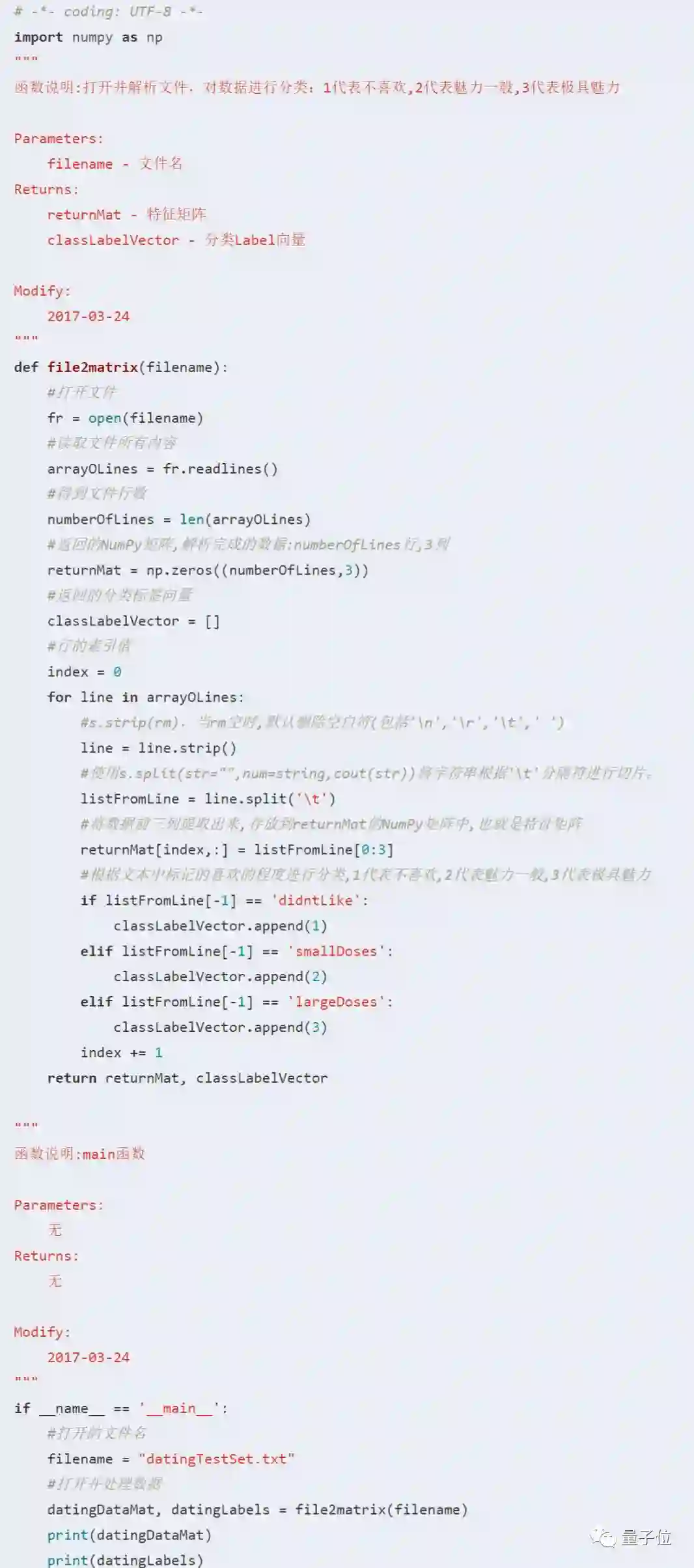 需要注意的是,10%的测试数据应该是随机选择的,由于海伦提供的数据并没有按照特定目的来排序,所以我么你可以随意选择10%数据而不影响其随机性。