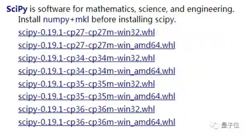 找到对应python版本的numpy+mkl和scipy,下载安装即可,如图3.3和图3.4所示。