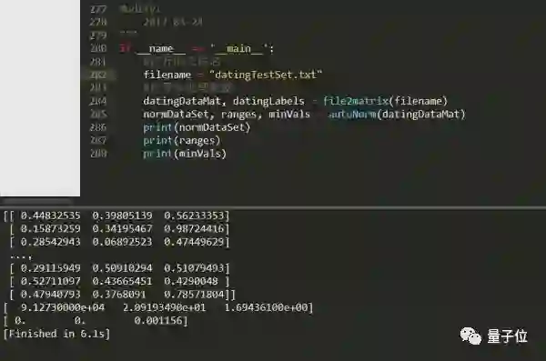 从图2.4的运行结果可以看到,我们已经顺利将数据归一化了,并且求出了数据的取值范围和数据的最小值,这两个值是在分类的时候需要用到的,直接先求解出来,也算是对数据预处理了。