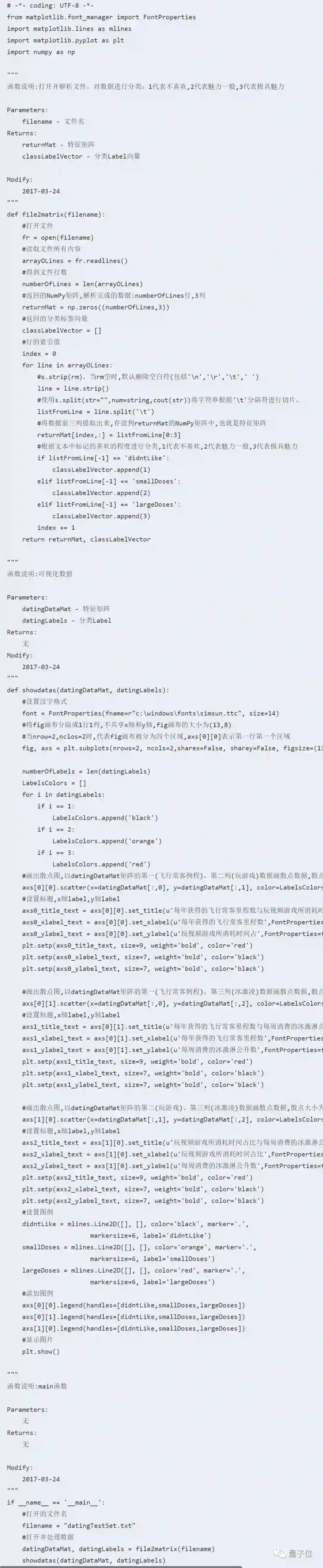 从上小结已经知道,要将数据分类两部分,即特征矩阵和对应的分类标签向量。在kNN_test02.py文件中创建名为file2matrix的函数,以此来处理输入格式问题。 将datingTestSet.txt放到与kNN_test02.py相同目录下,编写代码如下: