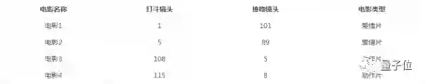 △ 表1.1 每部电影的打斗镜头数、接吻镜头数以及电影类型