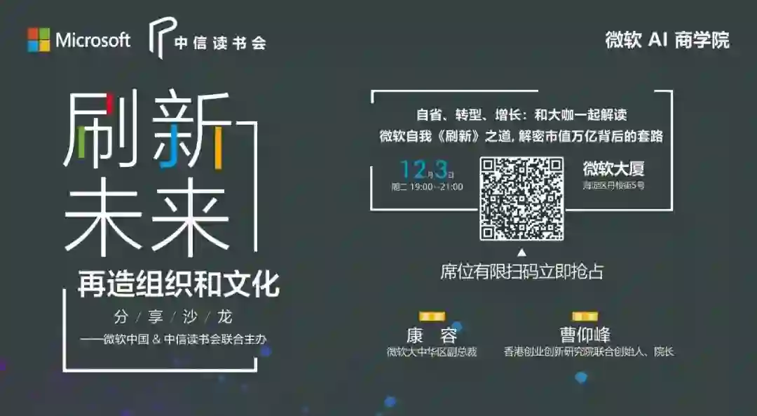 在12月3日微软 AI 商学院与中信出版集团联合举办的读书会中,由微软大中华区副总裁兼市场营销及运营总经理,人工智能及物联网业务总经理康容和《第四次管理革命》作者,香港创业创新研究院联合创始人、院长曹仰锋会带你找到答案。他们将在线分享微软转型之路,深入解读萨提亚首部自传《刷新:重新发现商业与未来》(以下简称《刷新》)一书,剖析企业成功转型的核心要素。
