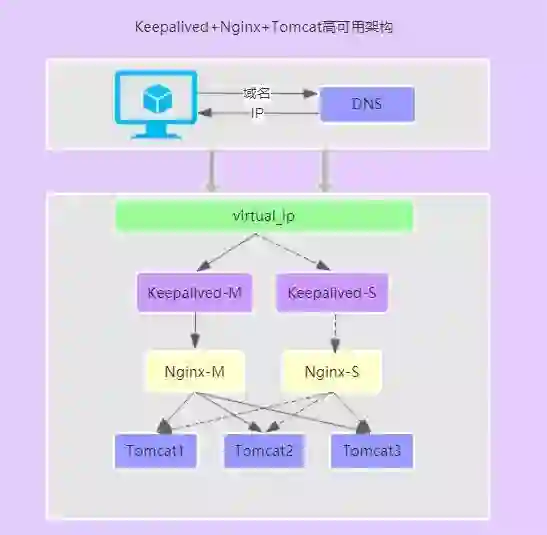 (1)用户通过域名请求到DNS,由DNS解析域名后返回对应的IP地址,该IP及为Keepalived映射服务器的虚拟IP