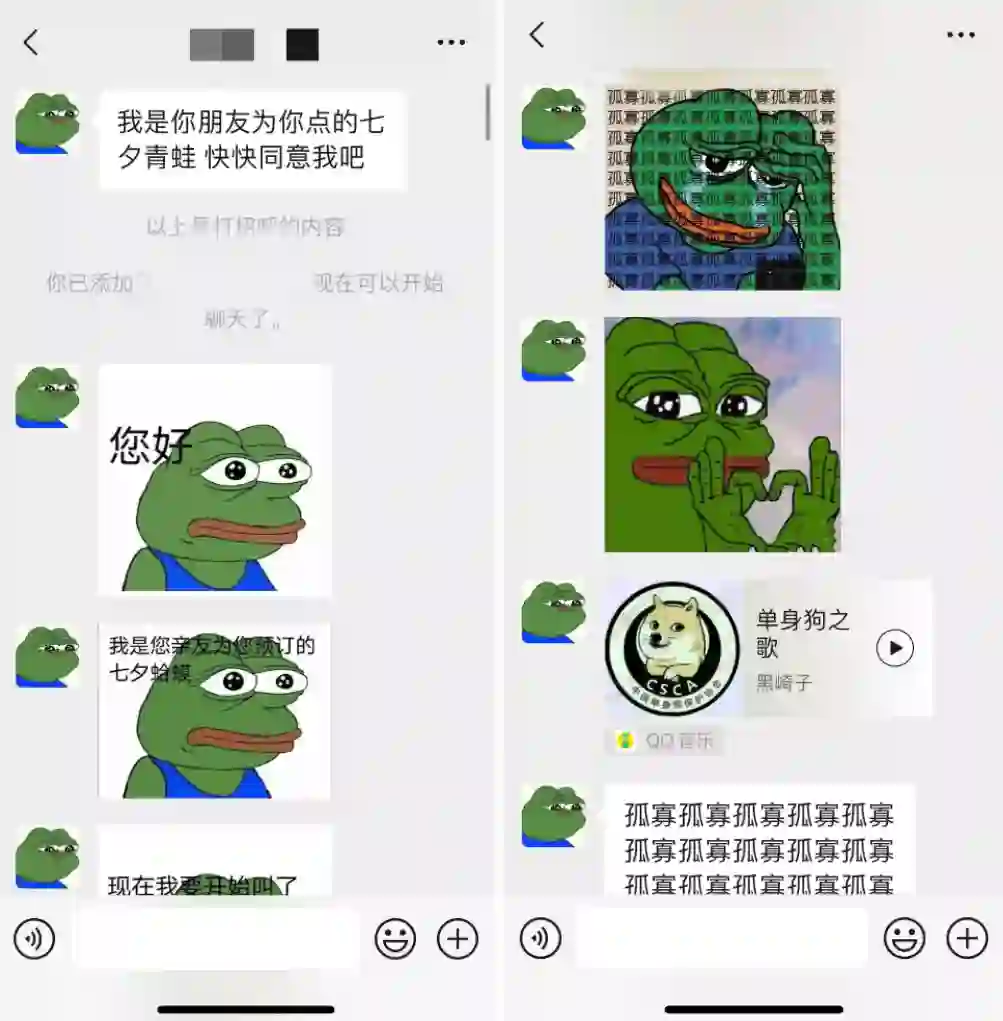 当时她单身,有朋友给她点了好几个“孤寡青蛙”。这一服务带有一点恶搞色彩:即有人加她微信,给她发信息,“您好,这是您朋友为您预定的七夕蛤蟆。现在我要开始叫了:孤寡孤寡孤寡孤寡孤寡孤寡孤寡孤寡孤寡孤寡孤寡孤寡孤寡孤寡孤寡……”。