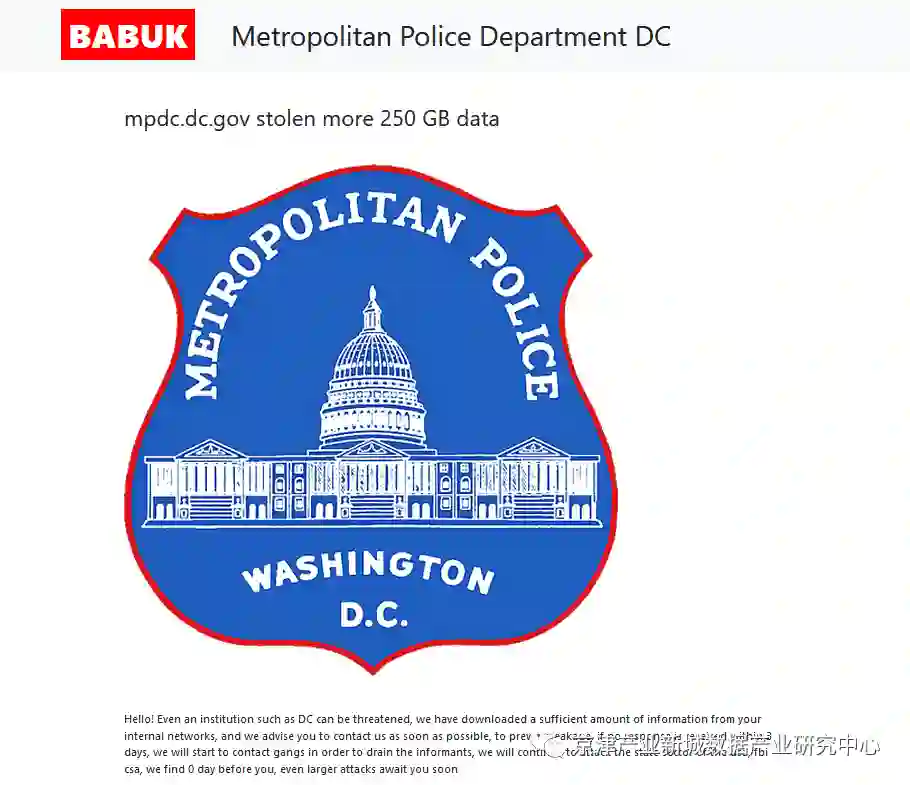 2021年4月26日,华盛顿哥伦比亚特区警察局称,其计算机网络遭到破坏。一个讲俄语的勒索病毒犯罪组织声称已窃取包括线人信息在内的敏感数据,并扬言要与当地犯罪团伙分享这些数据,除非警方支付未指明数额的赎金。