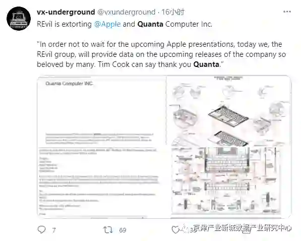 2021年4月,苹果笔记本代工厂广达遭勒索软件REvil攻击,黑客索要5000万美元天价赎金。REvil黑客组织警告,如果广达电脑不支付赎金,“所有Apple设备的图纸以及其员工和客户的所有个人数据将被发布”。超过支付期限后,赎金将翻倍至1亿美元。据悉,广达为苹果代工的产品包括Apple Watch、MacBookPro及MacBookAir等。目前泄露的似乎是Macbook的设计图。广达4月21日表示,已与外部技术专家合作,处理此次针对少部分服务器的网络攻击,公司日常营运未受影响。