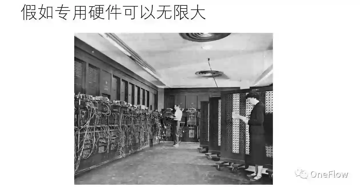 如果对任何一个神经网络都实现一套专用硬件,运行效率最高,可是开发效率不高,需求一变更(神经网络拓扑结构,层数,神经元个数),就需要重新设计电路,而硬件研发周期臭名昭著的长。这让人联想起冯诺依曼发明“存储程序”计算机之前的电子计算机(下图即第一台电子计算机ENIAC 的照片),计算机的功能通过硬连线(hard-wired)电路实现,要改变计算机的功能就需要重新组织器件间的连线,这种“编程”方式又慢又难以调试。
