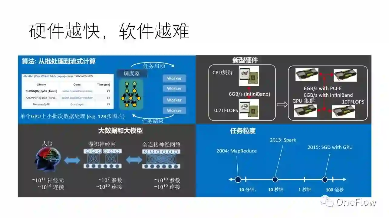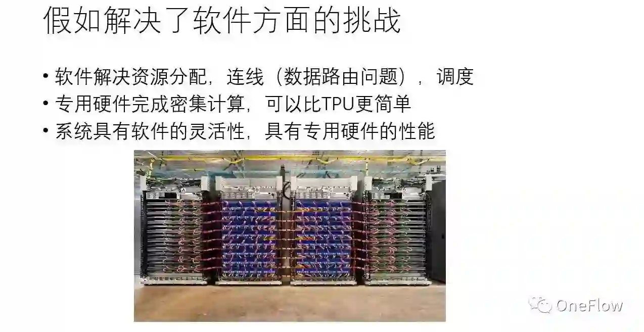 让我们重申一下几个观点:(1)软件真的非常关键;(2)我们对宏观层次(设备和设备之间)的优化更感兴趣;(3)深度学习框架存在一个理想的实现,正如柏拉图心中那个最圆的圆,当然现有的深度学习框架还相距甚远;(4)各行各业的公司,只要有数据驱动的业务,最终都需要一个自己的“大脑”,这种“大脑”不应该只被少数巨头公司独享。