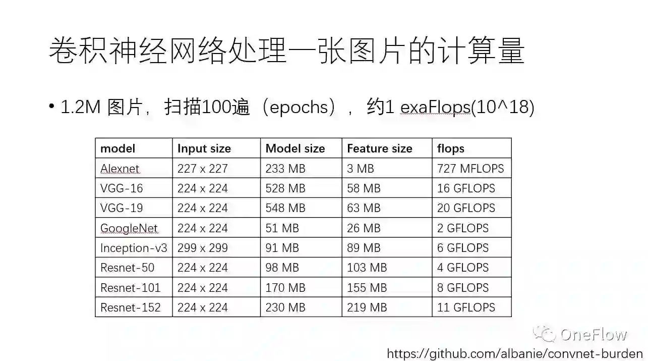 以大家耳熟能详的卷积神经网络CNN 为例,可以感觉一下目前训练深度学习模型需要多少计算力。下方这张表列出了常见CNN模型处理一张图片需要的内存容量和浮点计算次数,譬如VGG-16网络处理一张图片就需要16Gflops。值得注意的是,基于ImageNet数据集训练CNN,数据集一共大约120万张图片,训练算法需要对这个数据集扫描100遍(epoch),这意味着10^18次浮点计算,即1exaFlops。简单演算一下可发现,基于一个主频为2.0GHz的CPU core来训练这样的模型需要好几年的时间。