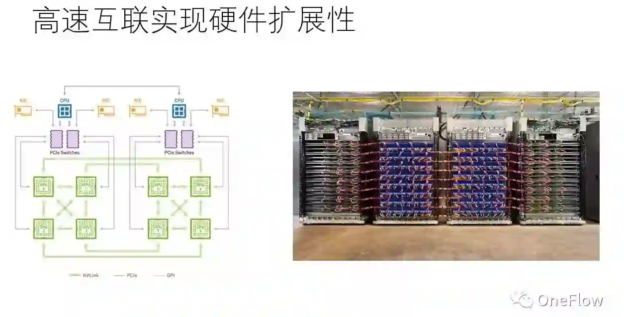 现实中,不管是通用硬件(如GPU)还是专用硬件(如TPU) 都可以通过高速互联技术连接在一起,通过软件协调多个设备来完成大规模计算。使用最先进的互联技术,设备和设备之间传输带宽可以达到100Gbps或者更多,这比设备内部带宽低上一两个数量级,不过幸好,如果软件“调配得当”,在这个带宽条件下也可能使得硬件计算饱和。当然,“调配得当”技术挑战极大,事实上,单个设备速度越快,越难把多个设备“调配得当”。