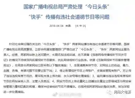 4月4日,国家广播电视总局发布通知,要严肃处理今日头条、快手传播有违社会道德节目等问题。并称“今日头条”和“快手”两家网站播出有违社会道德节目等问题,在不具备《信息网络传播视听节目许可证》的情况下持续顶风拓展视听节目服务,扰乱网络视听行业秩序。