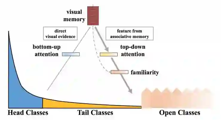 首先,我们通过聚集源自头部类别和尾部类别的知识获得了视觉记忆;然后将存储在内存中的视觉概念当作关联的记忆特征重新注入,以增强原来的直接特征。我们可以将其理解为利用诱导知识(即记忆特征)来帮助实现直接观察(即直接特征)。我们进一步学习了一个概念选择器来控制所要注入的记忆特征的数量和类型。由于头部类别知识已经获得了丰富的直接观察,所以它们只被注入了少量的记忆特征。相反,尾部类别获得的观察很少,于是记忆特征里的关联视觉概念就非常有用。最后,我们通过计算出获得视觉记忆的可达性,来调整开放类别的可信度。