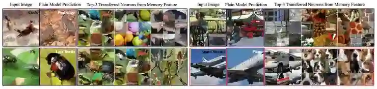 这里,我们通过将头部的激活神经元可视化,检查了记忆特征注入的视觉概念,如如图 6 所示。具体来说,对于每个输入图像,我们识别出了它在记忆特征中排名前 3 的迁移神经元。所有神经元都通过整个训练集上最高的一组激活补丁实现可视化。例如,为了将左上角的图像划分为尾部类别「公鸡」,我们的方法已经学会了依次迁移表示「鸟头」、「圆形」和「点状纹理」的视觉概念。在注入特征后,动态元嵌入层的信息丰富度和识别度变得更高。