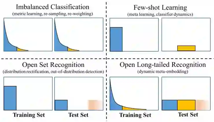 OLTR 并没有局限于字面上的定义,目前有三个问题和它密切相关,分别是不平衡分类、小样本学习和开集识别,通常人们都是孤立地看待它们,分别独立研究。图 3 概括了它们之间的差异。在评估视觉识别系统方面,新提出的 OLTR 可以成为更广泛、更现实的检验标准。