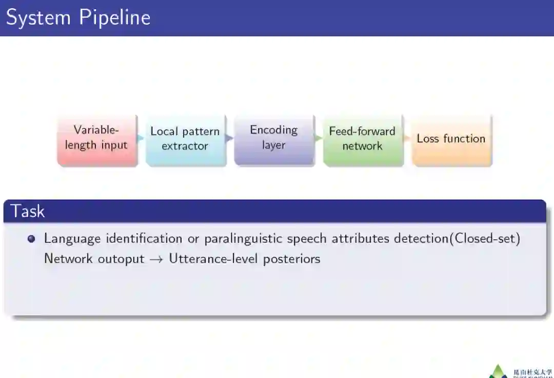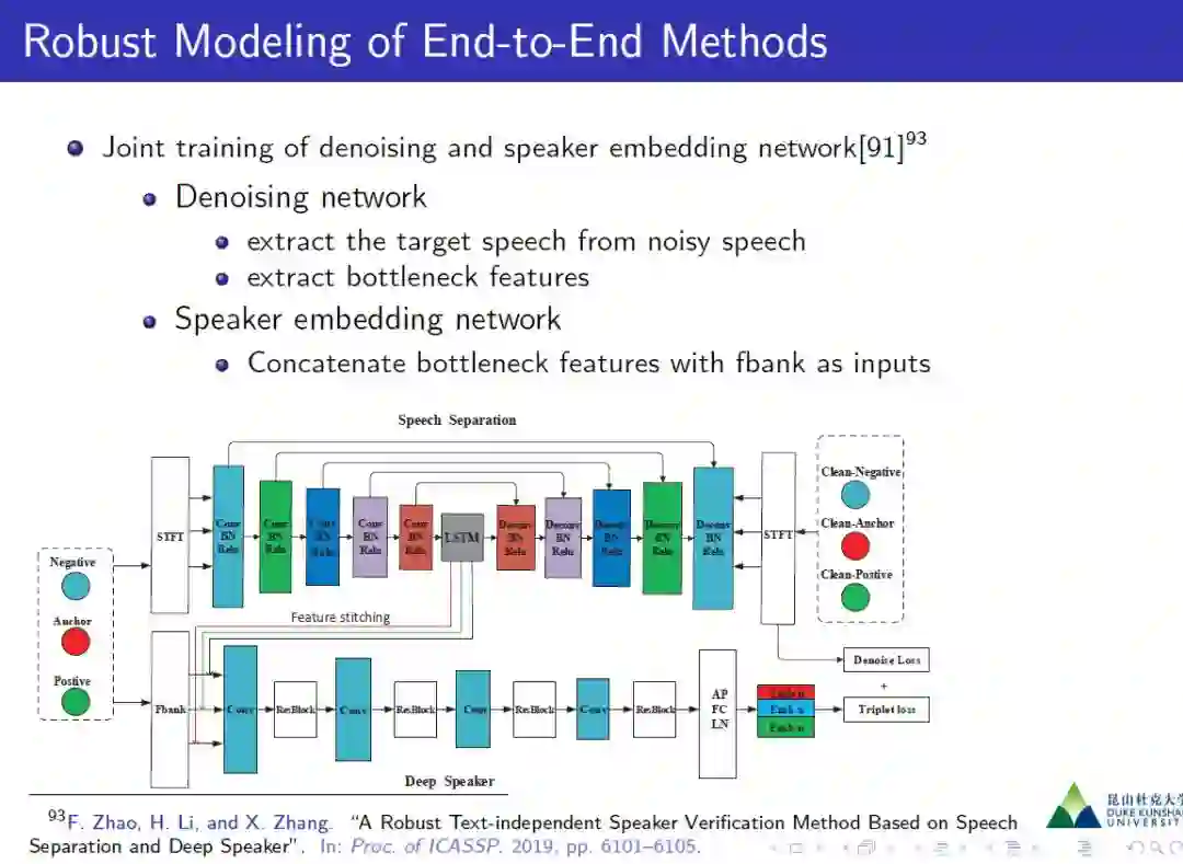 语音信号不仅包含词汇信息,还传递说话人、语言、性别、年龄、情感等多种副语言的语音属性信息。其背后的核心技术问题是基于文本独立或文本依赖的灵活时长语音信号的话语水平监督学习。在第一部分中,我们将首先阐述说话者和语言识别的问题。在第2节中,我们介绍了传统的流程中包含不同模块的框架,即特征提取、表示、可变性补偿和后端分类。然后很自然地引入端到端思想,并与传统框架进行了比较。我们将展示特征提取和CNN层、表示和编码层、后端建模和完全连接层之间的对应关系。具体来说,我们将在这里详细介绍端到端框架中的模块,如变长数据加载器、前端卷积网络结构设计、编码(或池)层设计、损失函数设计、数据增广设计、传输学习和多任务学习等。在第4节中,我们将介绍一些使用端到端框架来解决远场和噪声条件的鲁棒方法。最后,我们将把引入的端到端框架与其他相关任务连接起来,例如说话人二值化、副语言语音属性识别、反欺骗干扰对策等。