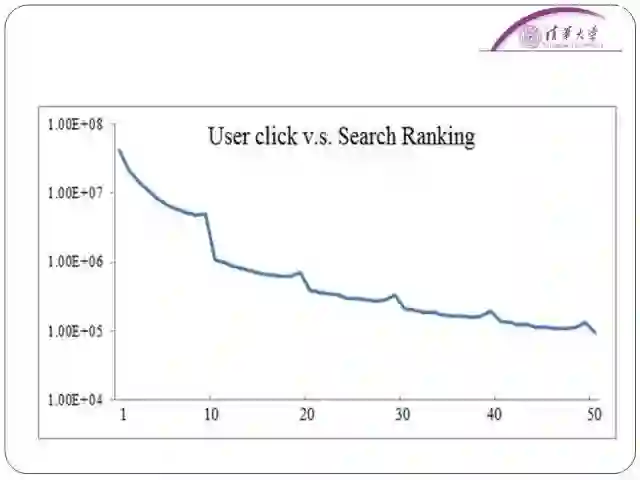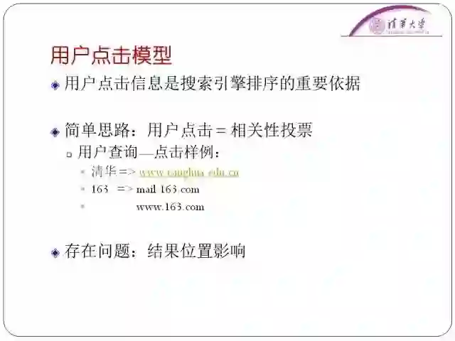 另外一个例子,就是用户点击模型。这其实是一个“前人栽树,后人乘凉”的工作,把搜索引擎上面的用户反馈情况记录下来分析用户需求。有一个简单的想法点击量越高越有可能是用户想要找的东西。