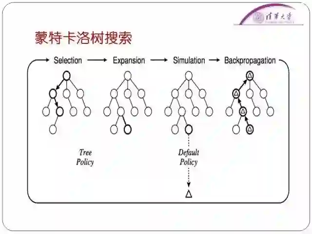 同时在蒙特卡洛树搜索中,采用了一种叫做“信心上限”的决策方法,也就是“多臂老虎机”决策问题。每个老虎机有一定的概率赢钱,多个老虎机,不同的老虎机赢钱的概率不一样。所以我可以站在旁边先看别人玩,先找到赢钱概率最大的决策方法。在模拟选择分支的时候,就把每一条路径看做一个老虎机。这之后选择最优路径然后继续随机模拟。模拟一轮后可能有胜有负,看胜率多少,然后把胜率最高的步骤传回。