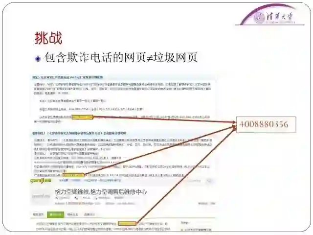 这种涉及到搜索引擎的诈骗问题也让很多公司苦恼,甚至还有很多公司因为这个问题被诉讼了。我们当时也觉得这种欺骗电话识别很难做。因为诈骗网页完全可以照抄厂家的官网,只是上面的客服电话不一样。后来调研了一番,我们发现这个问题实际上是可以被描述清楚的。这里面有哪些挑战呢?有的网站并不属于我们定义的垃圾网页范畴,所以采用垃圾网页识别的方法并不能很好的解决这个问题。