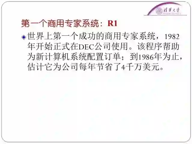 还有比如世界上第一个成功的商用专家系统R1。82年开始在DEC公司使用,是用来代替向厂家订货的工作的。当时据说可以节省4000万美元一年,它通过几千条的规则,覆盖了所有可能出现的情况。